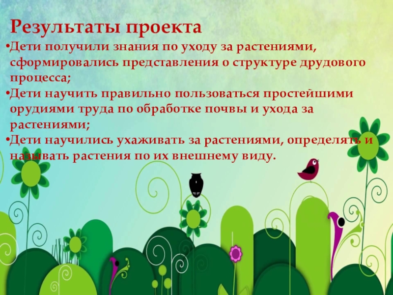 Результаты проектаДети получили знания по уходу за растениями, сформировались представления о структуре друдового процесса;Дети научить правильно пользоваться