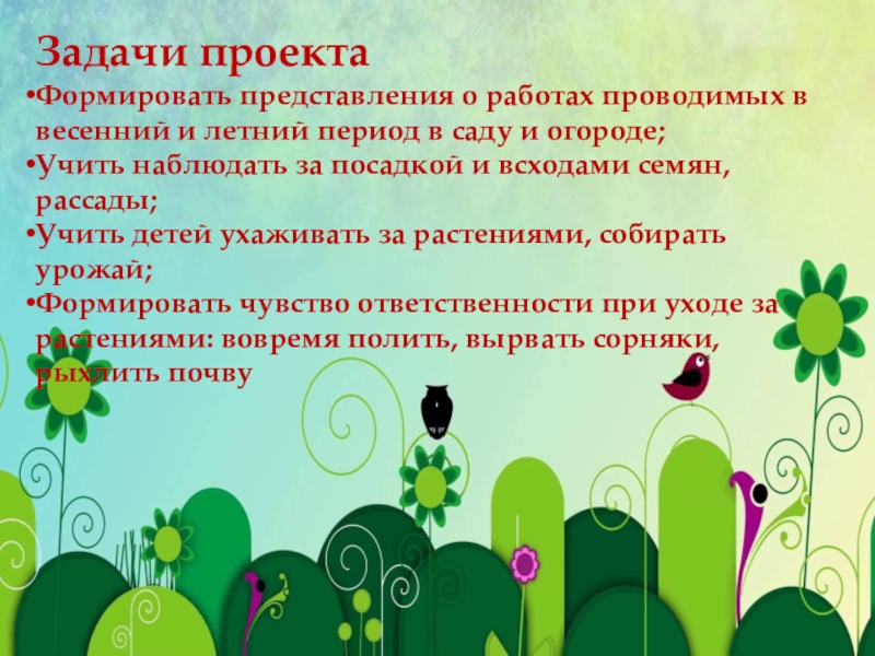 Задачи проектаФормировать представления о работах проводимых в весенний и летний период в саду и огороде;Учить наблюдать за