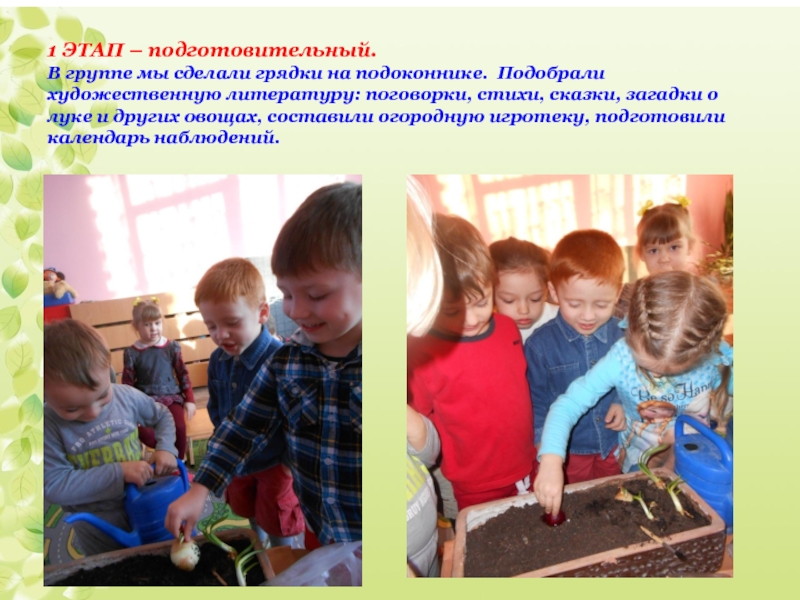 художественную литературу: поговорки, стихи, сказки, загадки о луке и других овощах, составили огородную игротеку, подготовили календарь наблюдений.