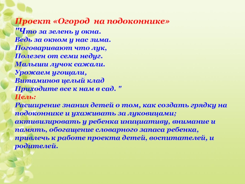 Расширение знания детей о том, как создать грядку на подоконнике и ухаживать за луковицами; активизировать у ребенка инициативу, внимание и память, обогащение словарного запаса ребенка, привлечь к работе проекта детей, воспитателей, и родителей.