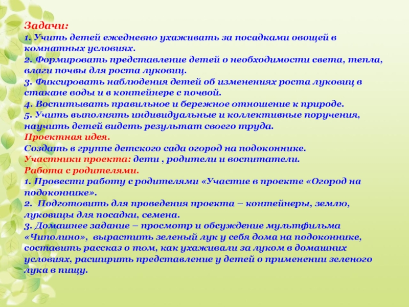 1. Провести работу с родителями «Участие в проекте «Огород на подоконнике».