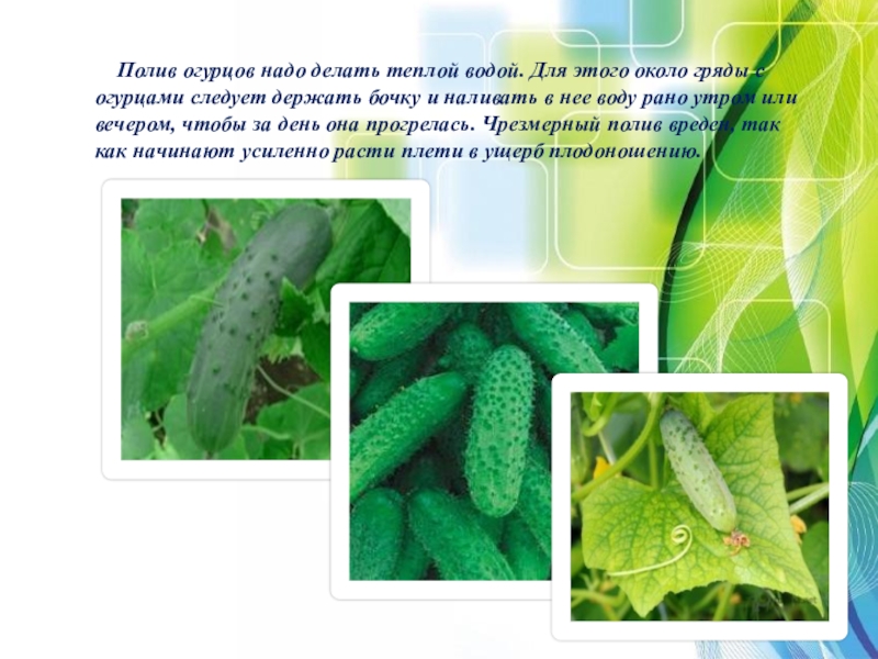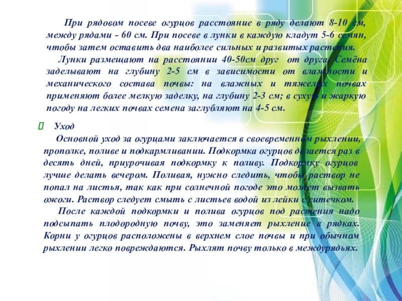 Основной уход за огурцами заключается в своевременном рыхлении, прополке, поливе и подкармливании. Подкормка огурцов делается раз в десять дней, приурочивая подкормку к поливу. Подкормку огурцов лучше делать вечером. Поливая, нужно следить, чтобы раствор не попал на листья, так как при солнечной погоде это может вызвать ожоги. Раствор следует смыть с листьев водой из лейки с ситечком.
