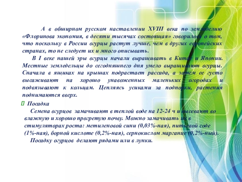 Семена огурцов замачивают в теплой воде на 12-24 ч и высевают во влажную и хорошо прогретую почву. Можно замачивать их в стимуляторах роста: метиленовой сини (0,03%-ная), питьевой соде (1%-ная), борной кислоте (0,2%-ная), сернокислом марганце (0,2%-ный).