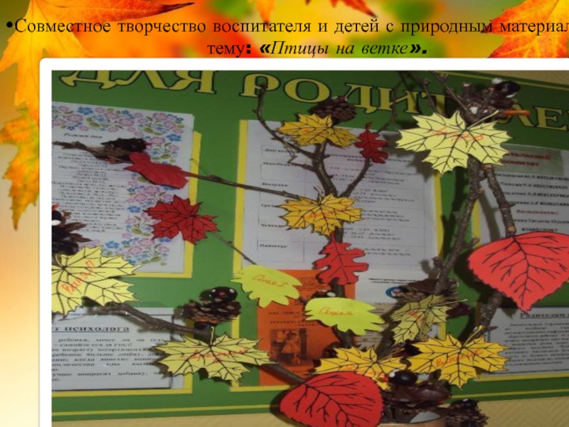 Слайд 12Совместное творчество воспитателя и детей с природным материалом на тему: «Птицы на