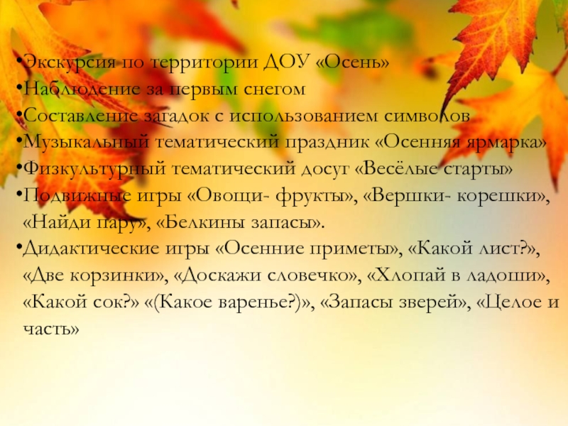 Дидактические игры «Осенние приметы», «Какой лист?»,«Две корзинки», «Доскажи словечко», «Хлопай в ладоши»,«Какой сок?» «(Какое варенье?)», «Запасы зверей», «Целое и часть»