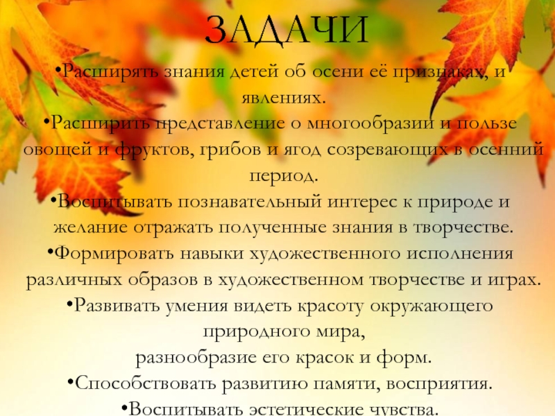 Расширить представление о многообразии и пользе овощей и фруктов, грибов и ягод созревающих в осенний период.