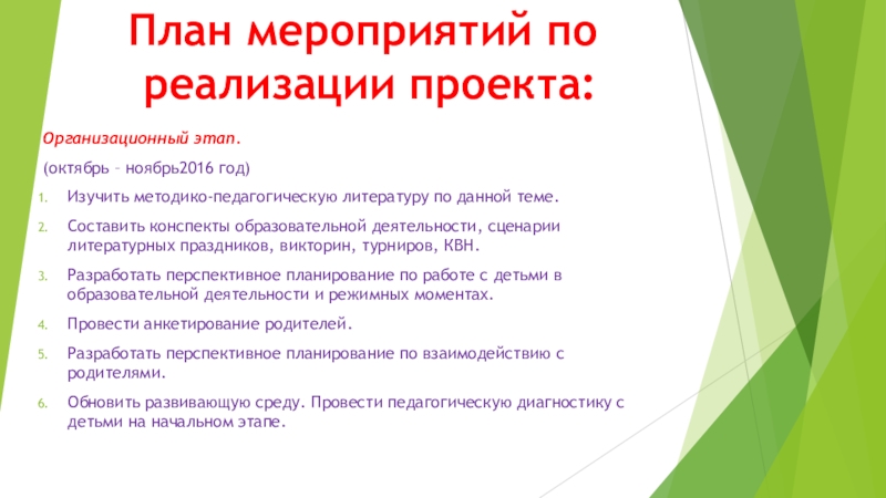 Слайд 16План мероприятий по реализации проекта: