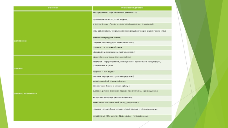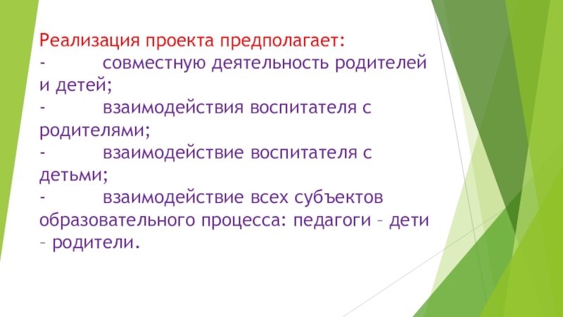 - взаимодействие всех субъектов образовательного процесса: педагоги – дети – родители.