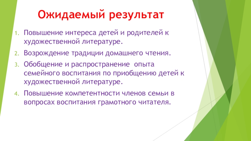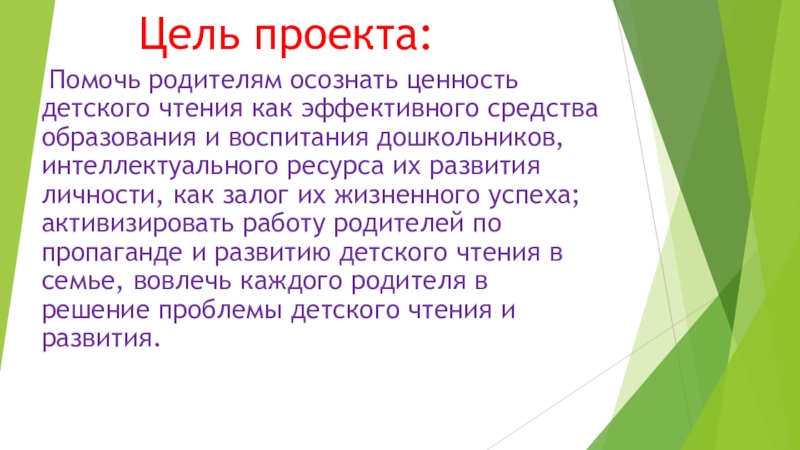 и воспитания дошкольников, интеллектуального ресурса их развития личности, как залог их жизненного успеха; активизировать работу родителей по пропаганде и развитию детского чтения в семье, вовлечь каждого родителя в решение проблемы детского чтения и развития.
