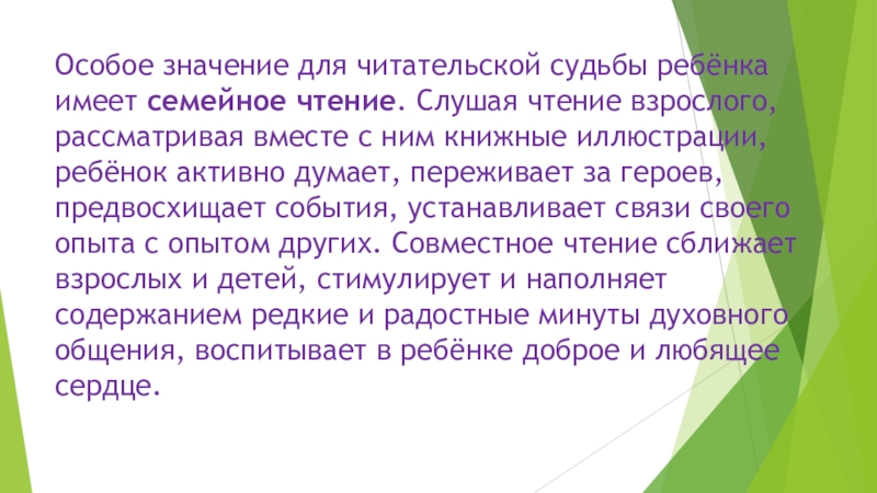 Слайд 3Особое значение для читательской судьбы ребёнка имеет семейное чтение. Слушая чтение взрослого,
