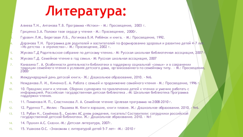 Нежданова Л. И., Киченко Е. А. Работа с семьей и продвижение семейного чтения – М.: Просвещение, 1996 г.