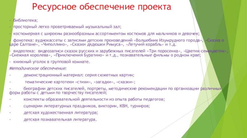 - фонотека: аудиокассеты с записями детских произведений «Волшебник Изумрудного города», «Сказка о царе Салтане», «Чиполлино», «Сказки дядюшки Римуса», «Летучий корабль» и т.д.