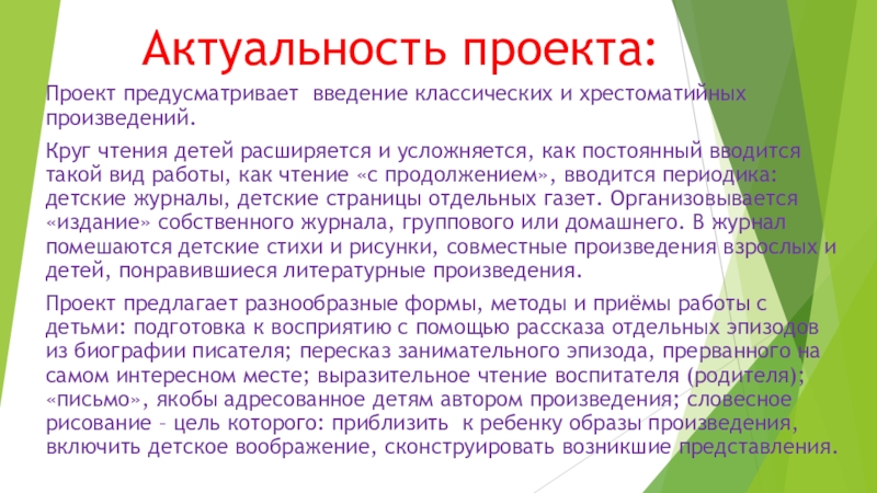 Проект предлагает разнообразные формы, методы и приёмы работы с детьми: подготовка к восприятию с помощью рассказа отдельных эпизодов из биографии писателя; пересказ занимательного эпизода, прерванного на самом интересном месте; выразительное чтение воспитателя (родителя); «письмо», якобы адресованное детям автором произведения; словесное рисование – цель которого: приблизить к ребенку образы произведения, включить детское воображение, сконструировать возникшие представления.