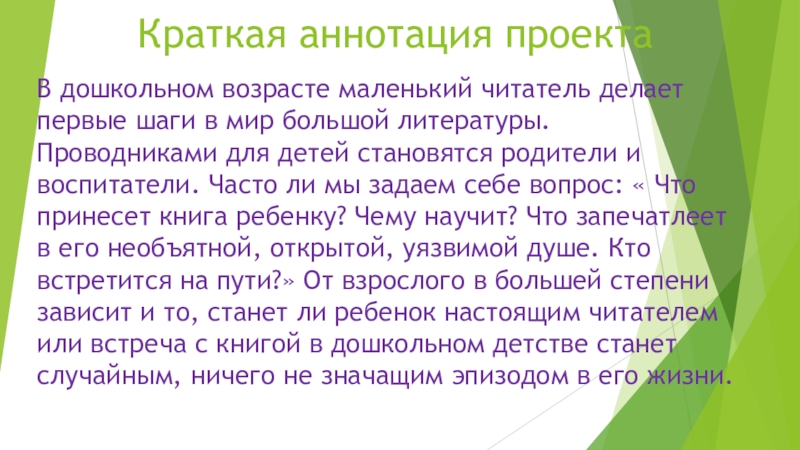 мир большой литературы. Проводниками для детей становятся родители и воспитатели. Часто ли мы задаем себе вопрос: « Что принесет книга ребенку? Чему научит? Что запечатлеет в его необъятной, открытой, уязвимой душе. Кто встретится на пути?» От взрослого в большей степени зависит и то, станет ли ребенок настоящим читателем или встреча с книгой в дошкольном детстве станет случайным, ничего не значащим эпизодом в его жизни.