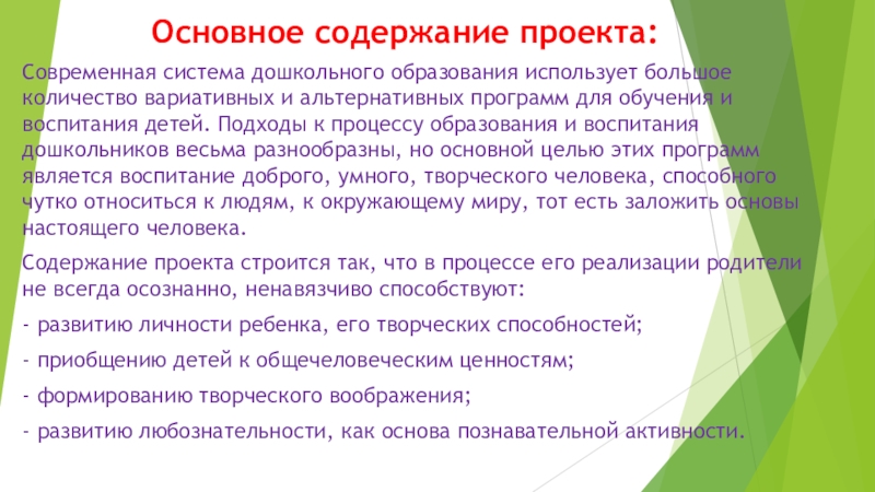 Содержание проекта строится так, что в процессе его реализации родители не всегда осознанно, ненавязчиво способствуют: