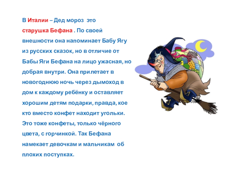 Слайд 20В Италии – Дед мороз это старушка Бефана . По своей внешности она напоминает Бабу
