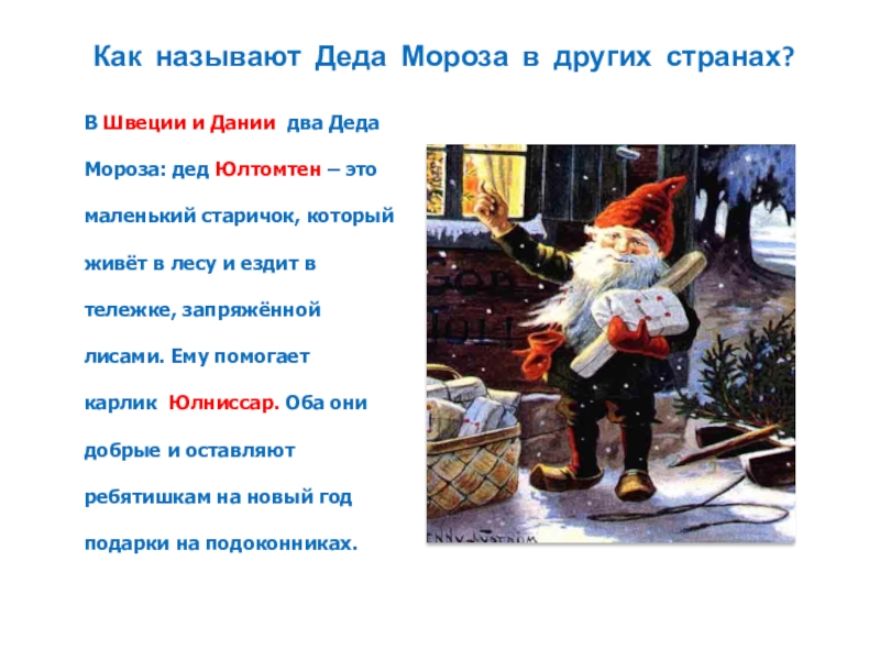 Мороза: дед Юлтомтен – это маленький старичок, который живёт в лесу и ездит в тележке, запряжённой лисами. Ему помогает карлик Юлниссар. Оба они добрые и оставляют ребятишкам на новый год подарки на подоконниках.