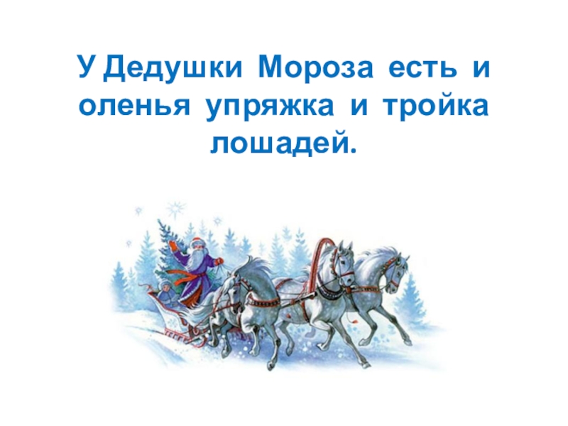 Слайд 15У Дедушки Мороза есть и оленья упряжка и тройка лошадей.