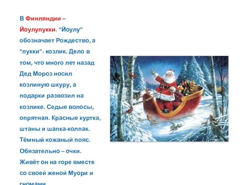 Слайд 23В Финляндии – Йоулупукки. “Йоулу” обозначает Рождество, а “пукки”- козлик. Дело