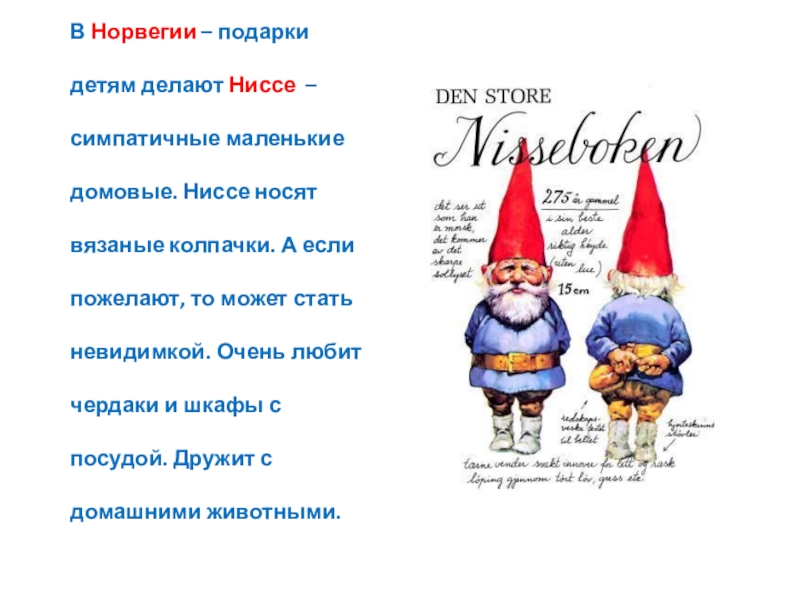 Слайд 21В Норвегии – подарки детям делают Ниссе – симпатичные маленькие домовые. Ниссе носят