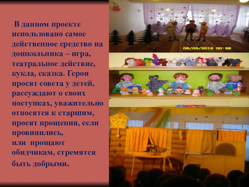 дошкольника – игра, театральное действие, кукла, сказка. Герои просят совета у детей, рассуждают о своих поступках, уважительно относятся к старшим, просят прощения, если провинились, или прощают обидчикам, стремятся быть добрыми.
