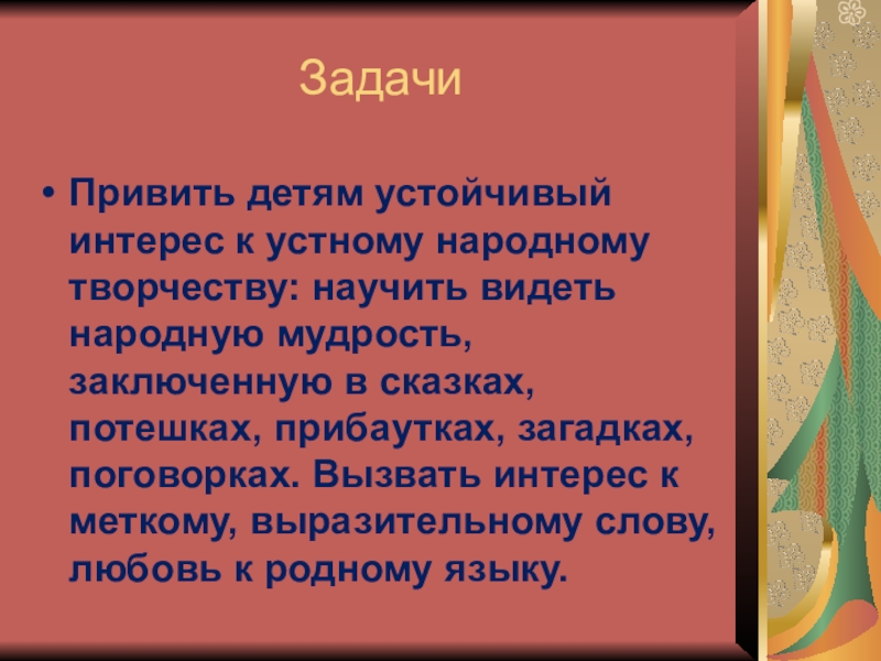 Привить детям устойчивый интерес к устному народному творчеству: научить видеть народную