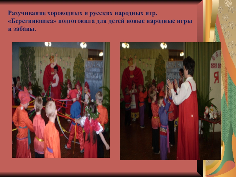 Слайд 29Разучивание хороводных и русских народных игр. «Берегинюшка» подготовила для детей новые