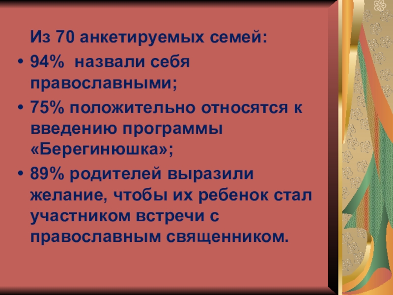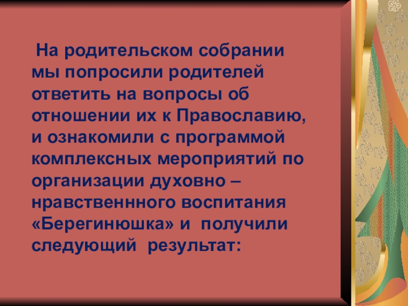 об отношении их к Православию, и ознакомили с программой комплексных мероприятий по организации духовно – нравственнного воспитания «Берегинюшка» и получили следующий результат: