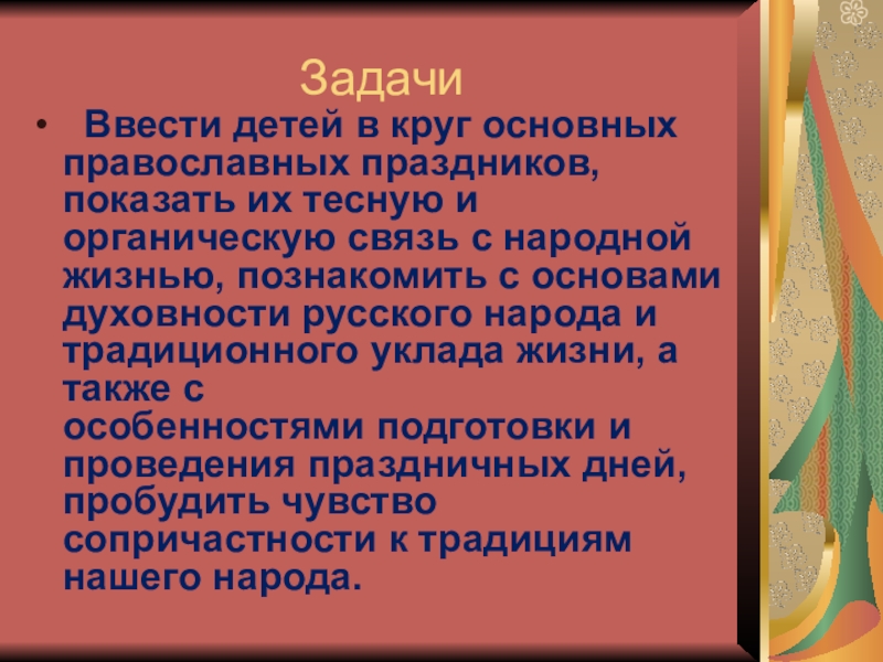 и органическую связь с народной жизнью, познакомить с основами духовности русского народа и традиционного уклада жизни, а также с особенностями подготовки и проведения праздничных дней, пробудить чувство сопричастности к традициям нашего народа.
