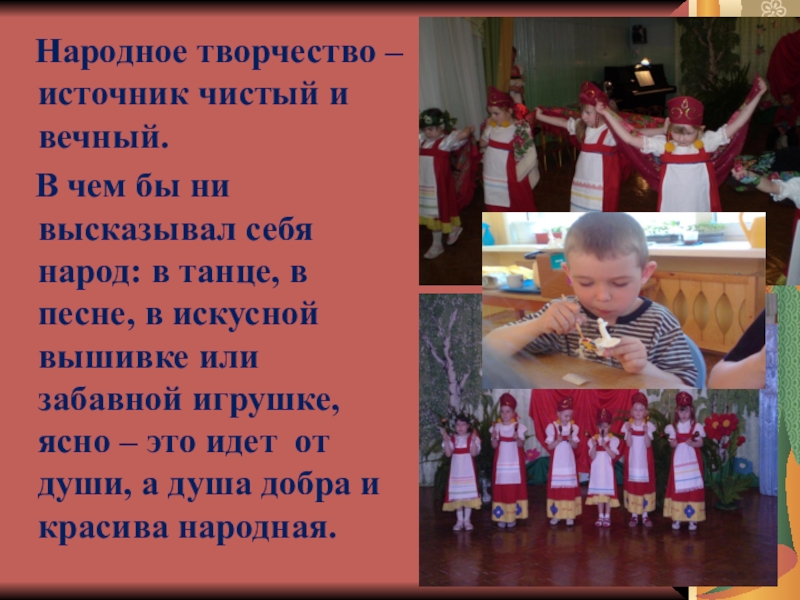 Слайд 7 Народное творчество – источник чистый и вечный.