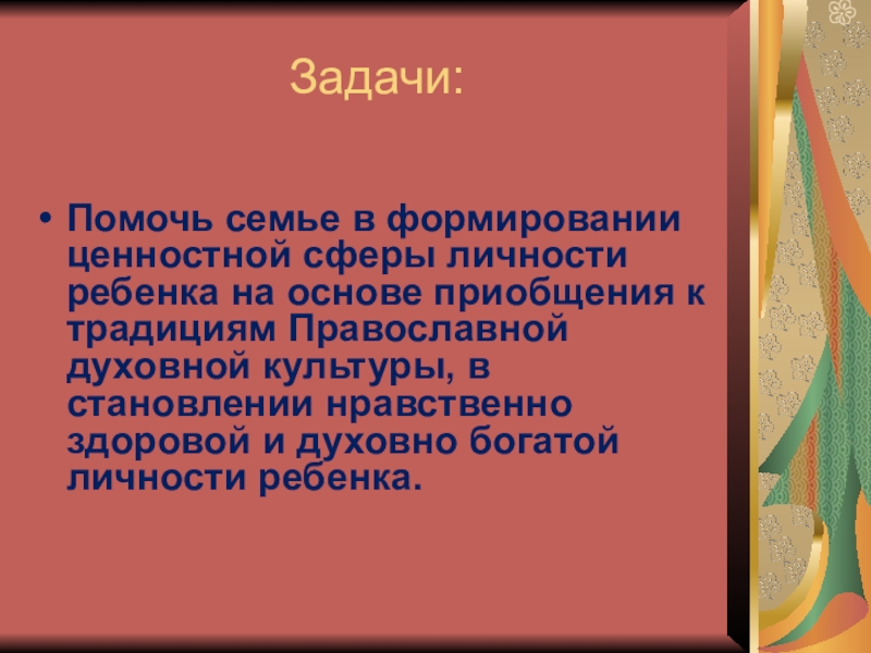 Помочь семье в формировании ценностной сферы личности ребенка на основе приобщения