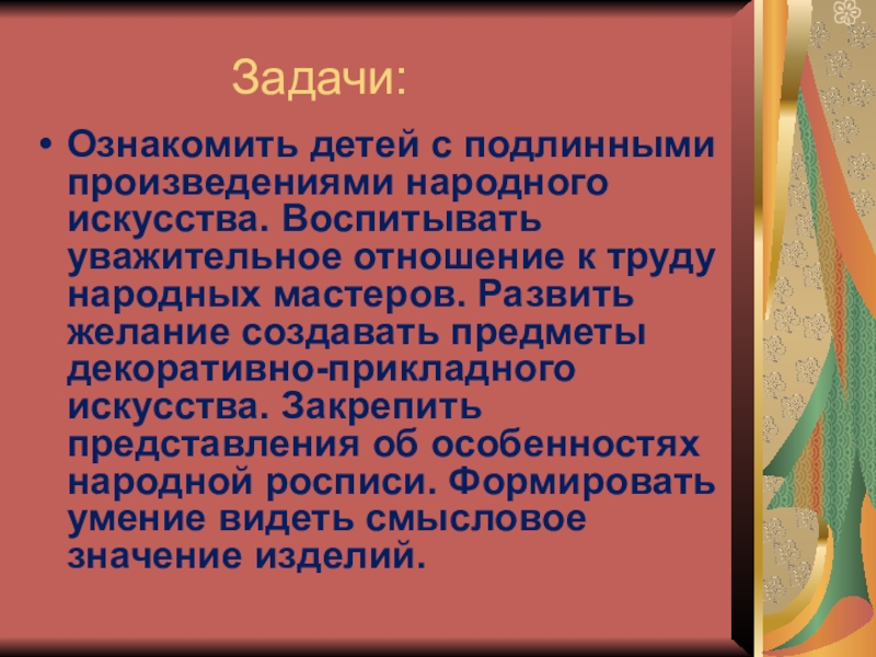 подлинными произведениями народного искусства. Воспитывать уважительное отношение к труду народных мастеров. Развить желание создавать предметы декоративно-прикладного искусства. Закрепить представления об особенностях народной росписи. Формировать умение видеть смысловое значение изделий.