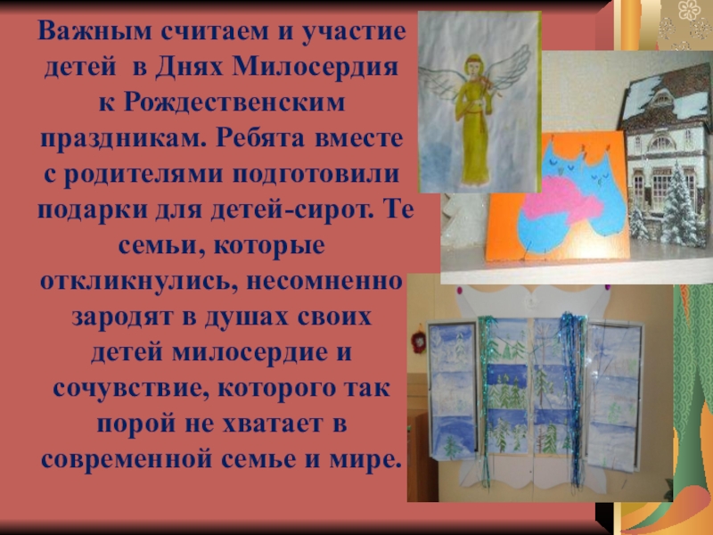 Слайд 28Важным считаем и участие детей в Днях Милосердия к Рождественским праздникам.