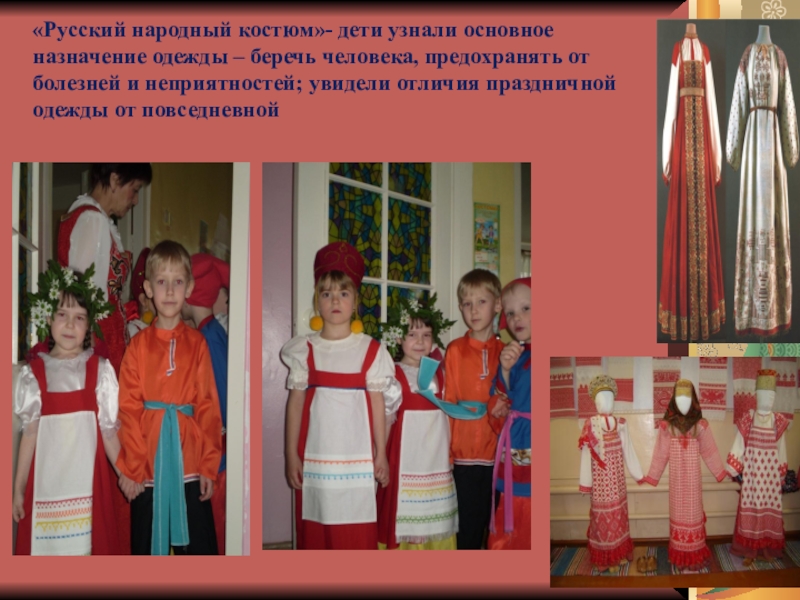 Слайд 30«Русский народный костюм»- дети узнали основное назначение одежды – беречь человека,