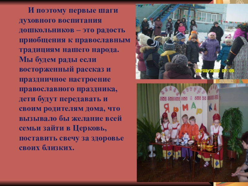 – это радость приобщения к православным традициям нашего народа. Мы будем рады если восторженный рассказ и праздничное настроение православного праздника, дети будут передавать и своим родителям дома, что вызывало бы желание всей семьи зайти в Церковь, поставить свечу за здоровье своих близких.