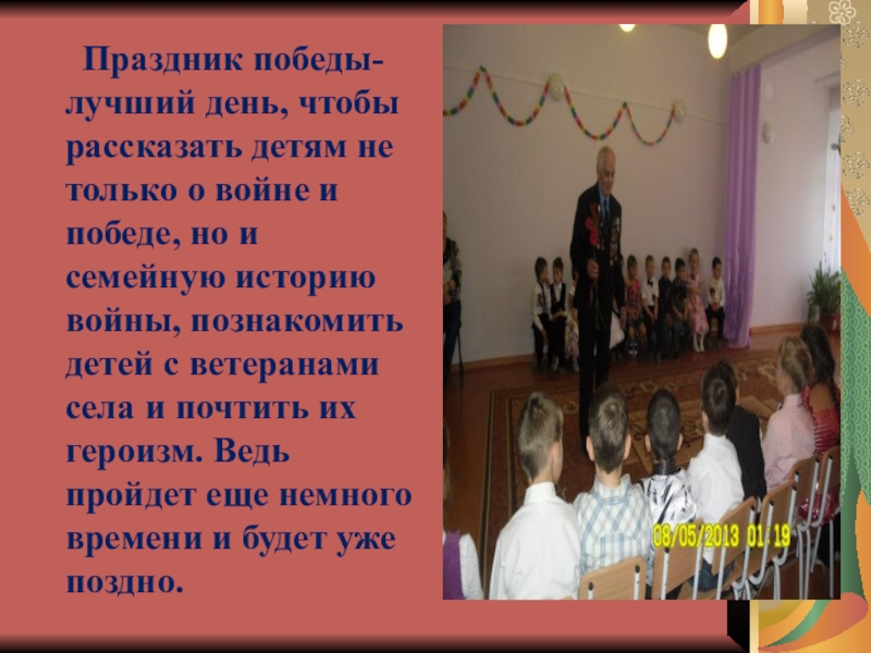 только о войне и победе, но и семейную историю войны, познакомить детей с ветеранами села и почтить их героизм. Ведь пройдет еще немного времени и будет уже поздно.
