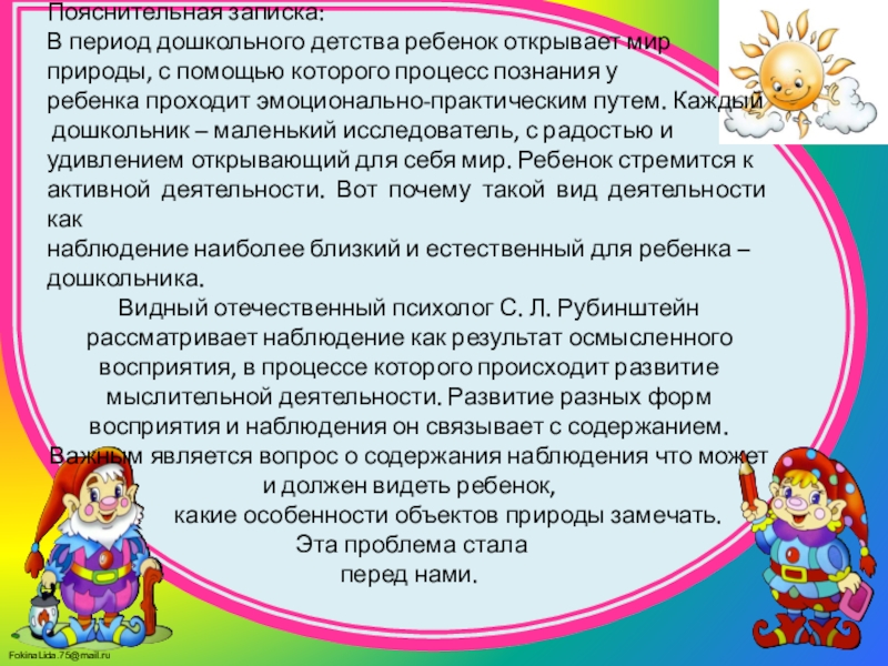 Видный отечественный психолог С. Л. Рубинштейн рассматривает наблюдение как результат осмысленного восприятия, в процессе которого происходит развитие мыслительной деятельности. Развитие разных форм восприятия и наблюдения он связывает с содержанием. Важным является вопрос о содержания наблюдения что может и должен видеть ребенок,