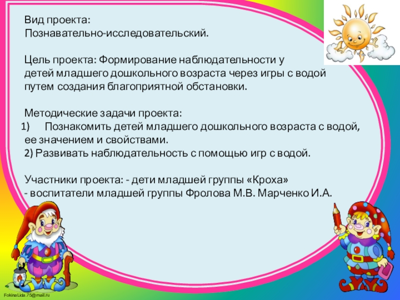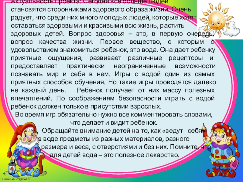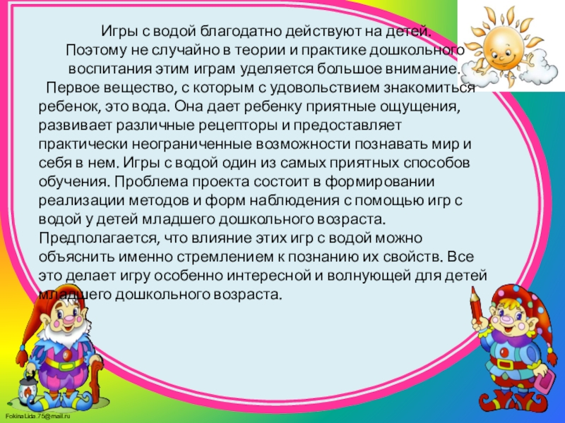 Первое вещество, с которым с удовольствием знакомиться ребенок, это вода. Она дает ребенку приятные ощущения, развивает различные рецепторы и предоставляет практически неограниченные возможности познавать мир и себя в нем. Игры с водой один из самых приятных способов обучения. Проблема проекта состоит в формировании реализации методов и форм наблюдения с помощью игр с водой у детей младшего дошкольного возраста. Предполагается, что влияние этих игр с водой можно объяснить именно стремлением к познанию их свойств. Все это делает игру особенно интересной и волнующей для детей младшего дошкольного возраста.
