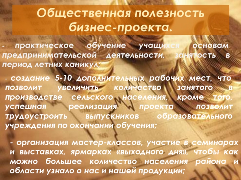 - создание 5-10 дополнительных рабочих мест, что позволит увеличить количество занятого в производстве сельского населения, кроме того, успешная реализация проекта позволит трудоустроить выпускников образовательного учреждения по окончании обучения;