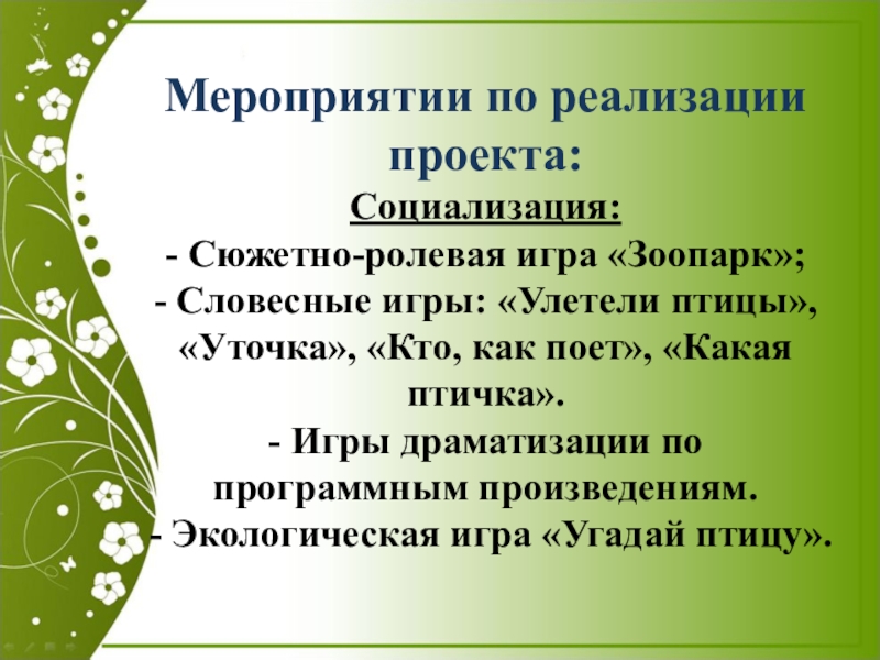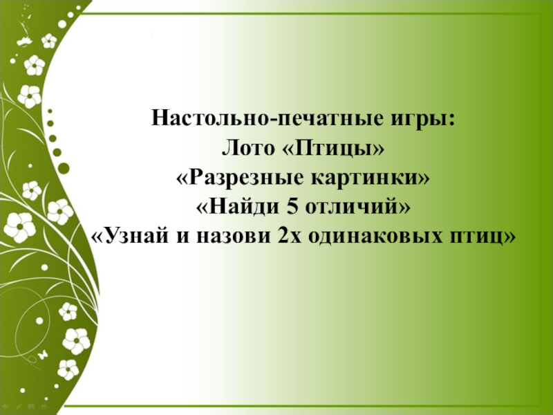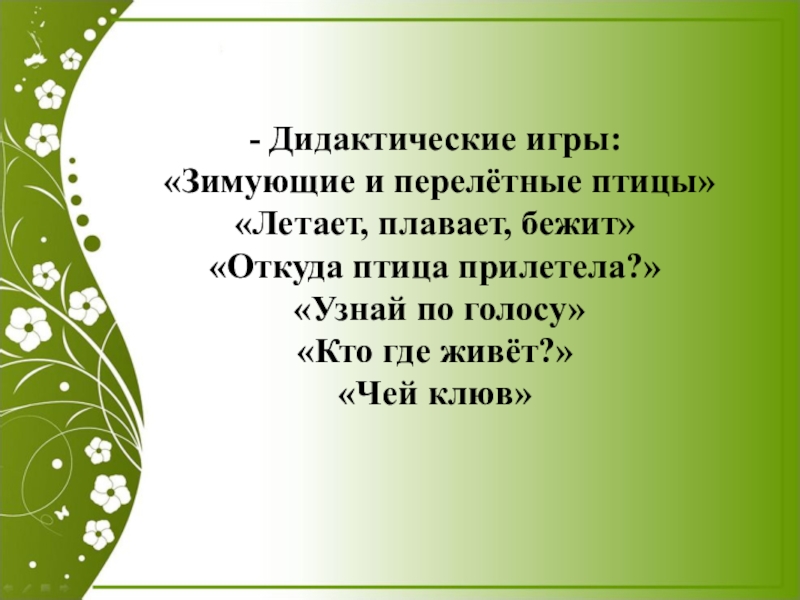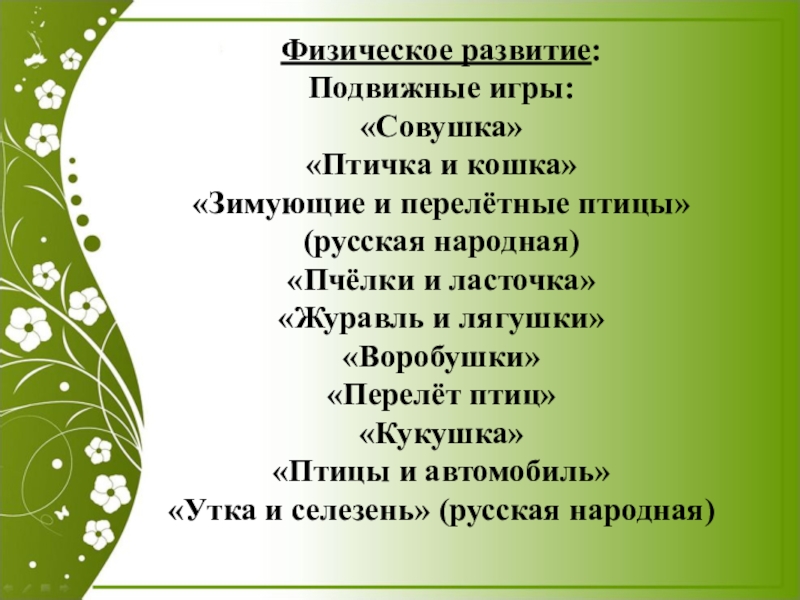 - Словесные игры: «Улетели птицы», «Уточка»,