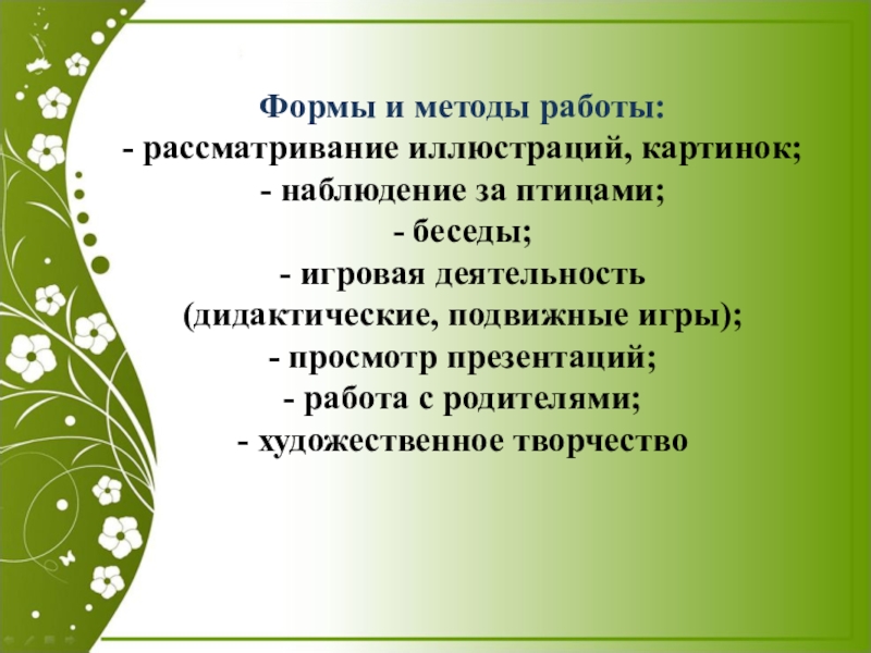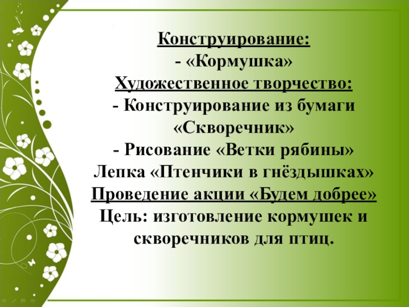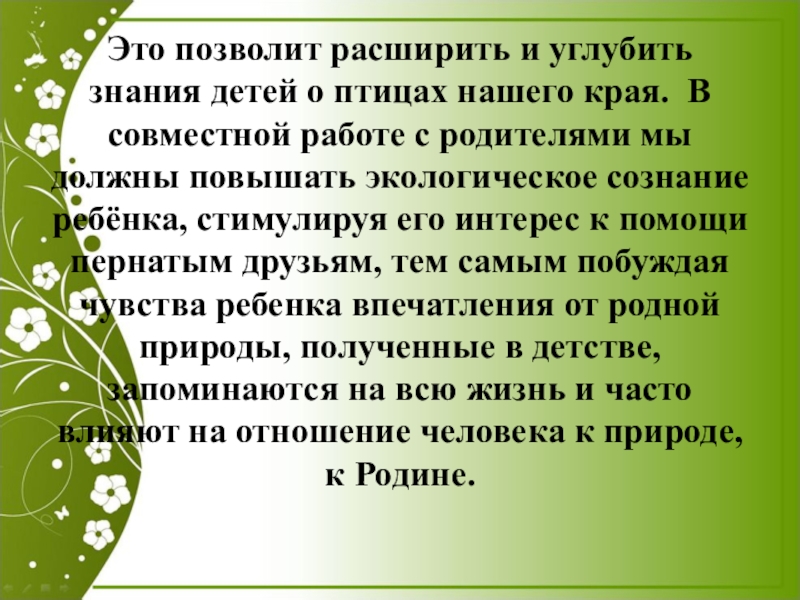 В совместной работе с родителями мы должны повышать экологическое сознание ребёнка, стимулируя его интерес к помощи пернатым друзьям, тем самым побуждая чувства ребенка впечатления от родной природы, полученные в детстве, запоминаются на всю жизнь и часто влияют на отношение человека к природе, к Родине.
