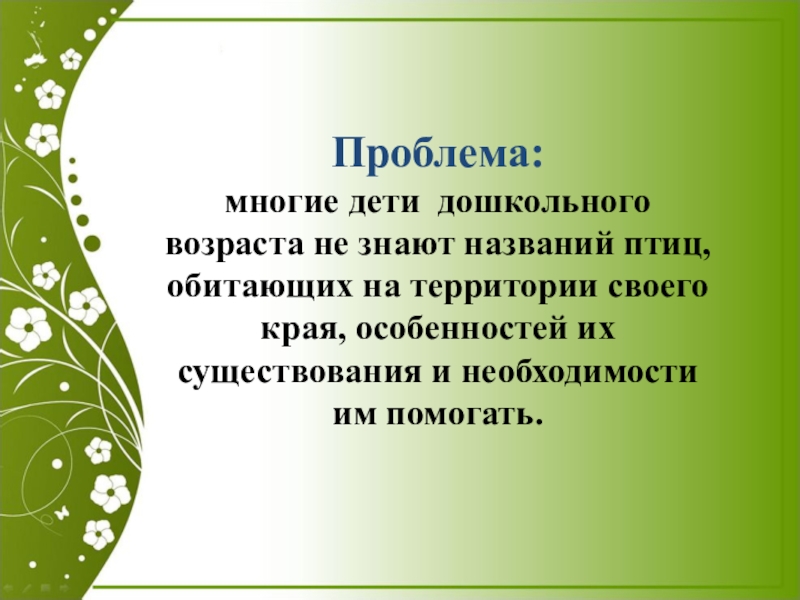 недостаточно развиты знания о птицах родного края. Дети зачастую путают зимующих и перелётных птиц. Также у детей недостаточно развито чувство заботы о птицах. Мы решили реализовать проект « Птицы Южного Урала»!