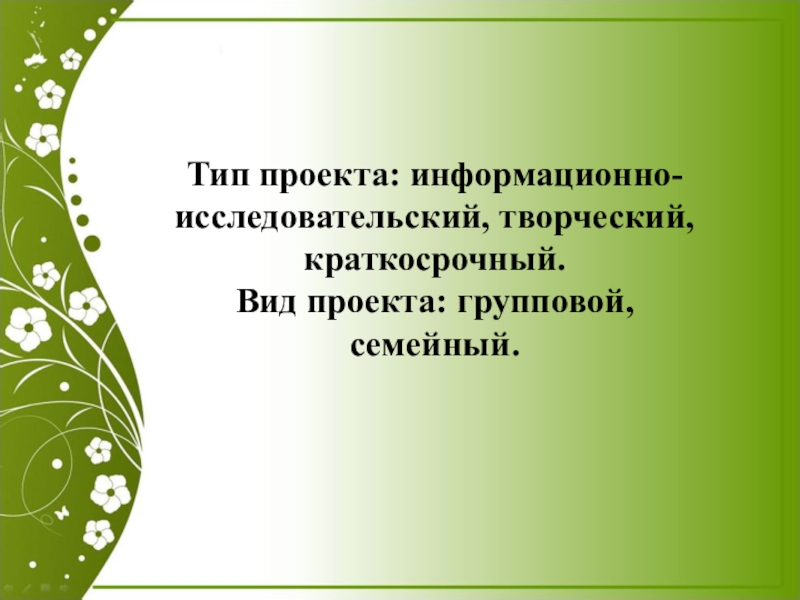 Слайд 4Тип проекта: информационно-исследовательский, творческий, краткосрочный.