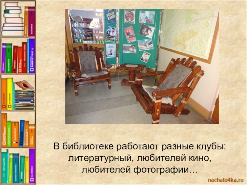 В библиотеке работают разные клубы:литературный, любителей кино, любителей фотографии…