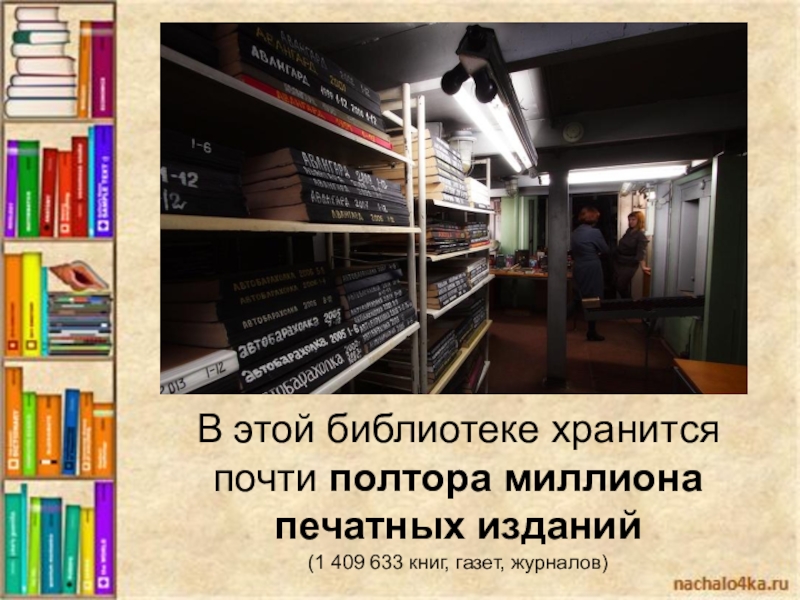 В этой библиотеке хранитсяпочти полтора миллиона печатных изданий(1 409 633 книг, газет, журналов)