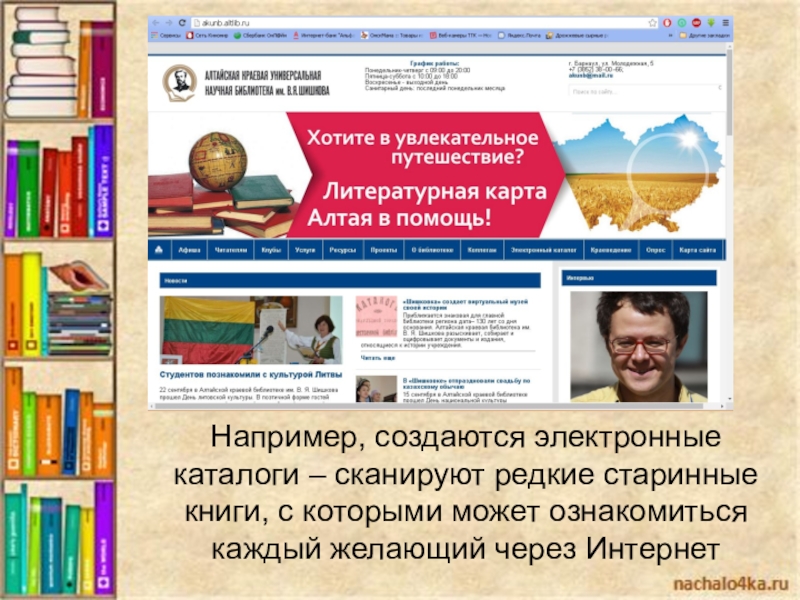 Слайд 12Например, создаются электронные каталоги – сканируют редкие старинные книги, с которыми