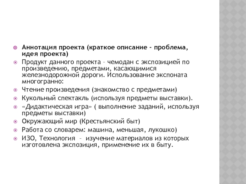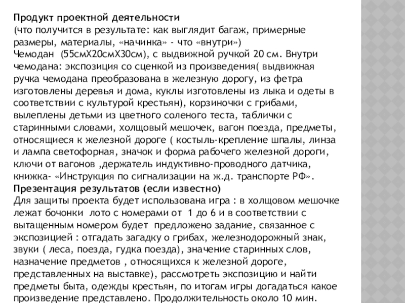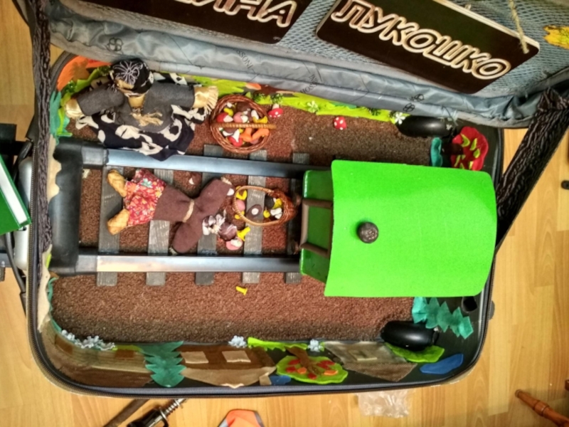 Чемодан (55смХ20смХ30см), с выдвижной ручкой 20 см. Внутри чемодана: экспозиция со сценкой из произведения( выдвижная ручка чемодана преобразована в железную дорогу, из фетра изготовлены деревья и дома, куклы изготовлены из лыка и одеты в соответствии с культурой крестьян), корзиночки с грибами, вылеплены детьми из цветного соленого теста, таблички с старинными словами, холщовый мешочек, вагон поезда, предметы, относящиеся к железной дороге ( костыль-крепление шпалы, линза и лампа светофорная, значок и форма рабочего железной дороги, ключи от вагонов ,держатель индуктивно-проводного датчика, книжка- «Инструкция по сигнализации на ж.д. транспорте РФ».