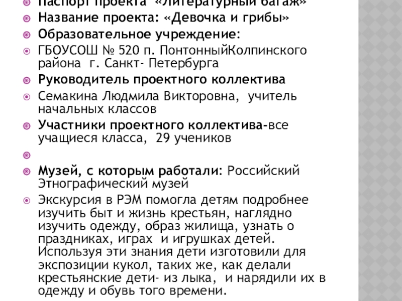 Экскурсия в РЭМ помогла детям подробнее изучить быт и жизнь крестьян, наглядно изучить одежду, образ жилища, узнать о праздниках, играх и игрушках детей. Используя эти знания дети изготовили для экспозиции кукол, таких же, как делали крестьянские дети- из лыка, и нарядили их в одежду и обувь того времени.