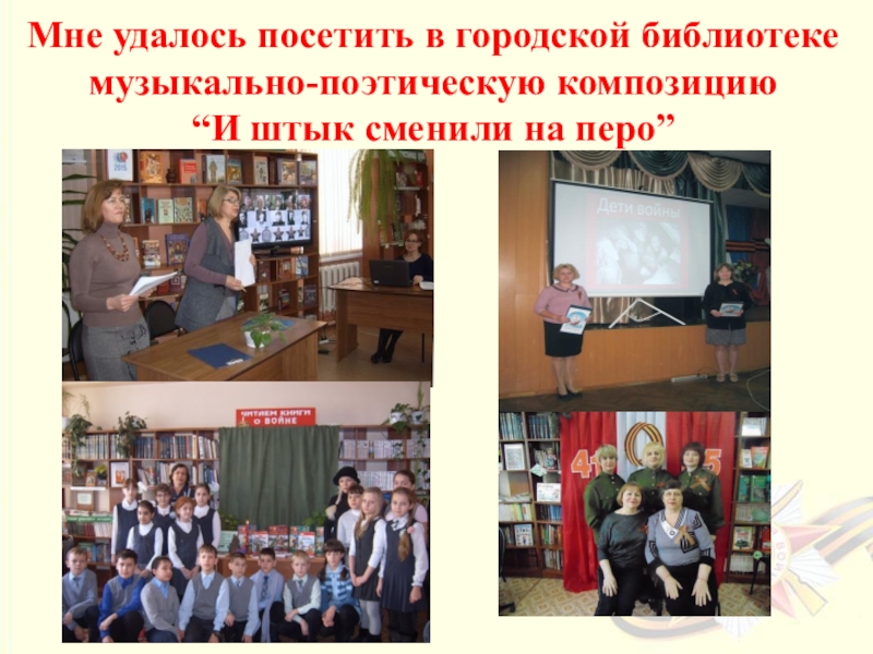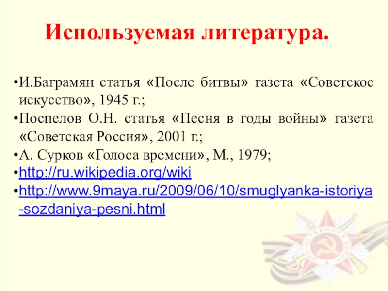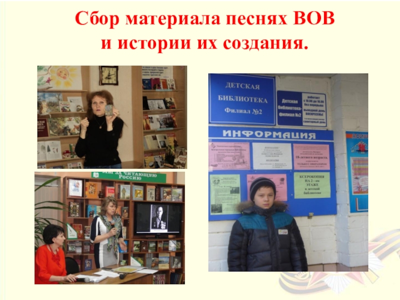 Собрать материал о песнях ВОВ в библиотеке.
