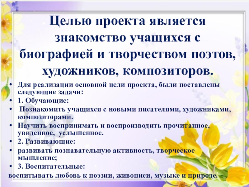 Познакомить учащихся с новыми писателями, художниками, композиторами.
